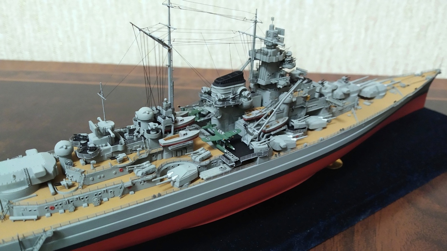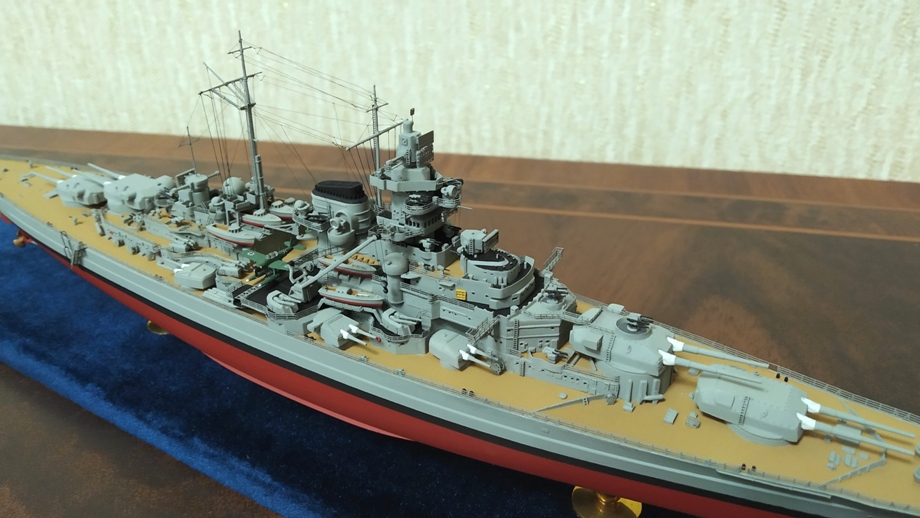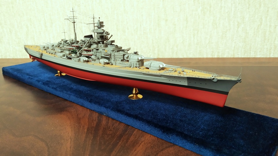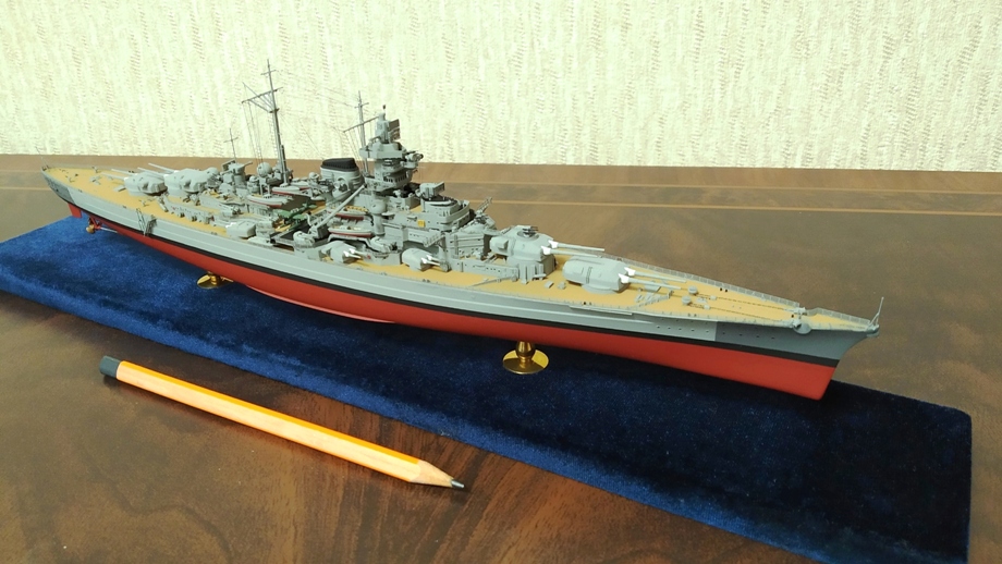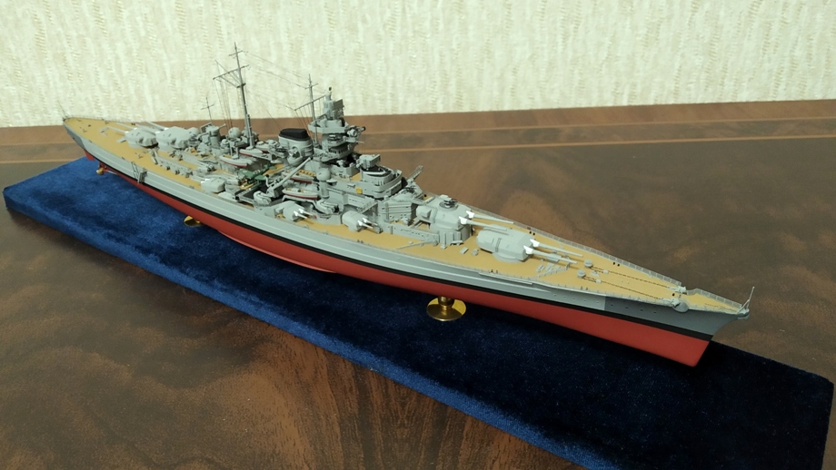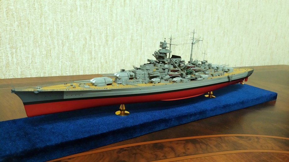 Модель-миниатюра линкора "Тирпиц" в M1:700. Общая длина - 358 мм. Несмотря на мелкий масштаб, эта модель практически не уступает по уровню детализации работам в M1:350. Автору удалось воссоздать витиеватую конструкцию надстройки, характерную для немецких линкоров времён II мировой.