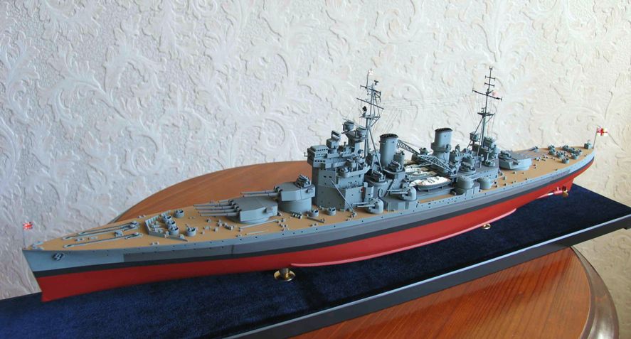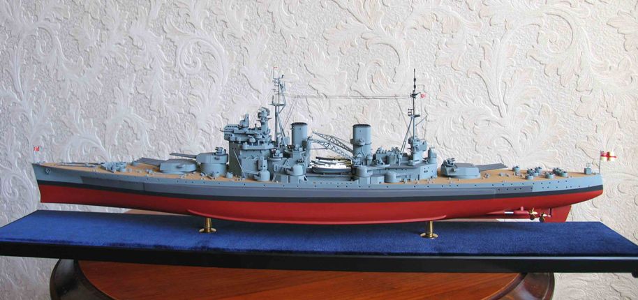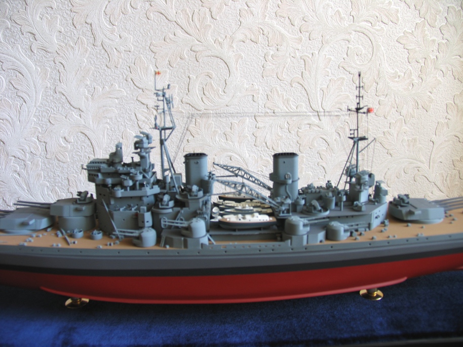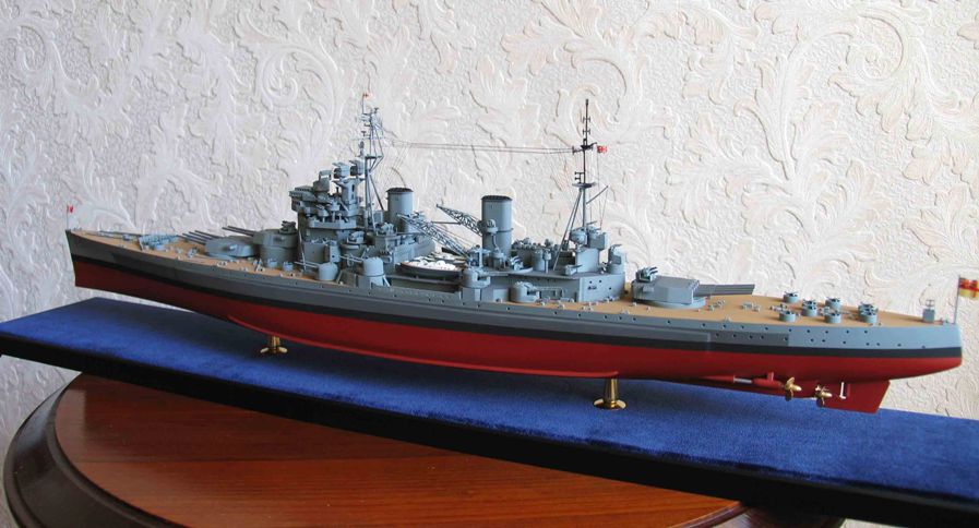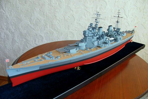Общая длина - 650 мм. За основу модели британского линкора взят широко известный пластиковый набор "Tamia". Чтобы модель соответствовала кораблю-прототипу, пришлось изрядно потрудиться, выводя верные обводы корпуса. Кроме того, были доведены до масштабных пропорций ограждения на надстройке и волноломы, выпилены ажурные конструкции кранов, тонко проработаны мачты и антенны. Много времени и сил ушло на доработку плавсредств - больших и малых катеров, баркасов, шлюпок и ялов (а их на модели ни много ни мало 14 единиц).
