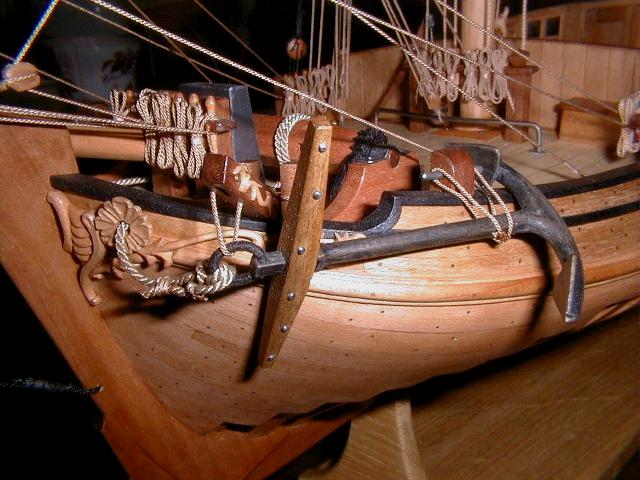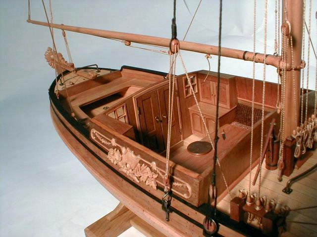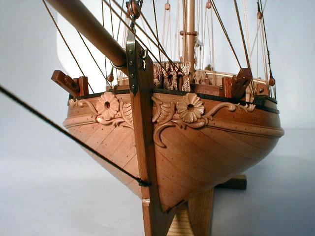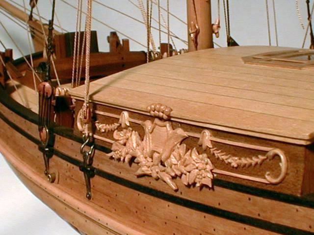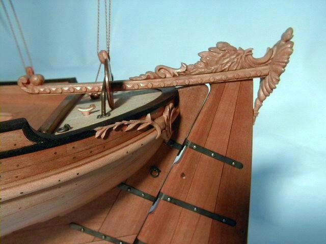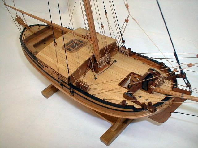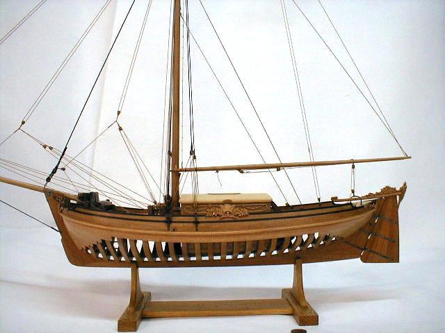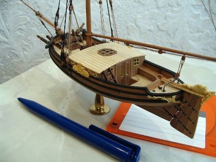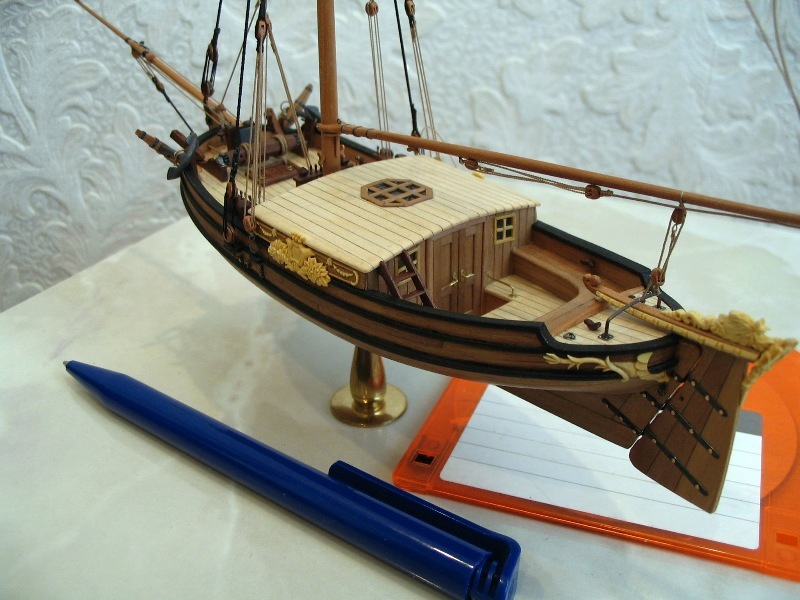 1. Модель-миниатюра в M1:72. Общая длина - 260 мм. При изготовлении модели использовались ценные породы дерева - орех, горная груша. Палуба сделана из клена. Резные украшения выполнены из реликтового колхидского самшита (см. фото 1-2). Для выступления на чемпионатах NAVIGA модель была включена в диораму "Бриг "Меркурий" и яхта".