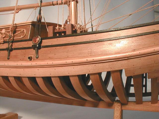 2. Модель-копия в M1:24. Общая длина - 660 мм. Изготовлена по авторским чертежам, в основу которых легла информация из книги Fredrik Henrik of Chapman "Архитектура морских судов" (см. фото 3-11). Паруса на модели убраны. Выполнена с применением экзотических и редких пород дерева - горной груши, ореха, манилы, розового дерева. На подводную часть корпуса обшивка не устанавливалась, благодаря чему отлично просматриваются детали его внутренней конструкции. Крыша каюты съемная. Убранство каюты буера воссоздано по старинным гравюрам (см. фото 9).