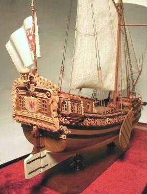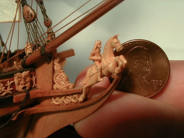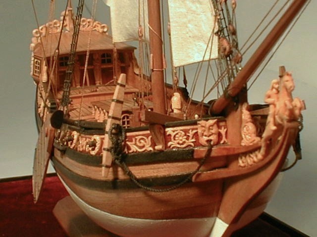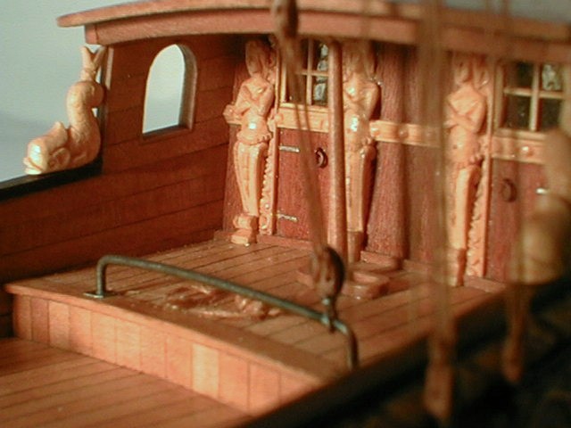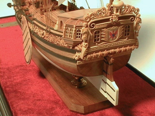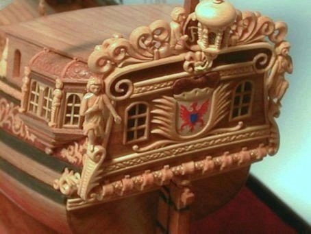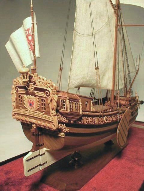 Модель-копия в M1:100. Общая длина - 293 мм. Выполнена в так называемом дворцовом стиле с применением экзотических и редких пород дерева. Модель имеет сложный резной декор, изготовленный из реликтового колхидского самшита, и множество миниатюрных деталей (в частности, размер носовой фигуры всадника составляет всего 10x14 мм).