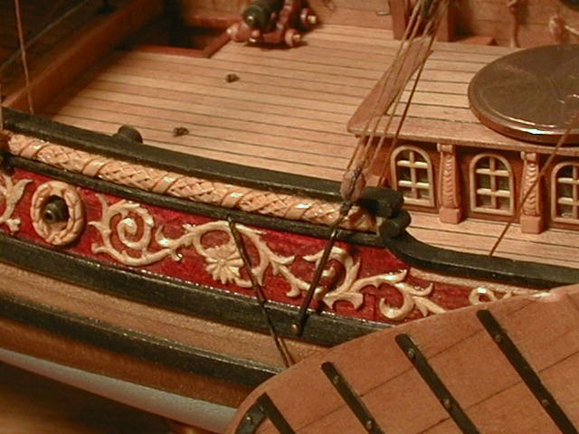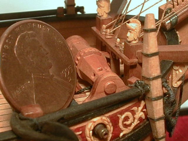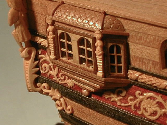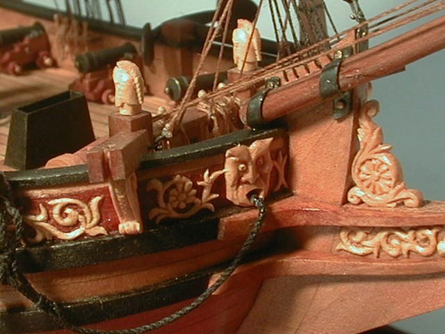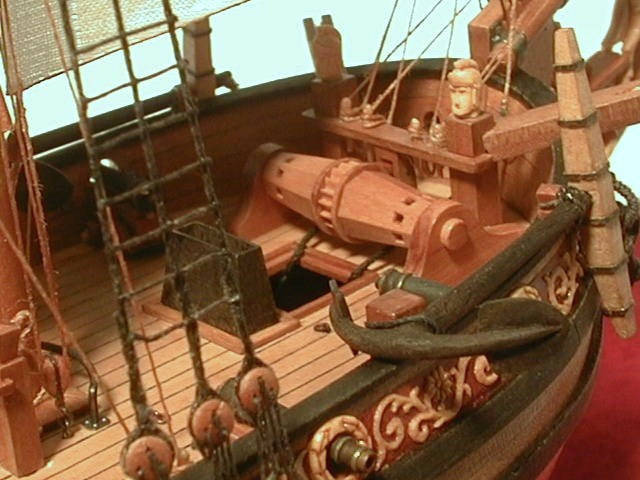 Привальный брус на бортах модели, планширь, якоря и дымовая труба камбуза изготовлены из эбена (черного дерева). Пушки выточены из бронзы и патинированы. Каждый орудийный лафет состоит из 20 деталей. Сложность этой работы можно оценить по следующему факту – на ось лафета диаметром 0.8 мм насаживалось колесо размером в 2 мм, которое фиксировалось шпилькой диаметром всего 0.15 мм.