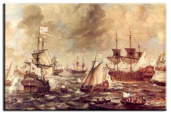 Дошло до нашего времени и изображение “Золотой яхты”. На картине “Флот великого курфюрста”, написанной Фершеером в 1684 г., в центре большой флотилии находится знаменитая яхта.