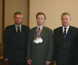 На фотографии (слева направо): начальник управления ДОСААФ П.А. Лебедев; призёр чемпионатов мира и Европы Д.И. Калмыков; заместитель премьер-министра Республики Беларусь В.Н. Дражин.