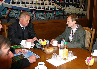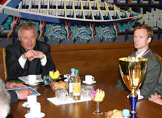 В Совете Министров Республики Беларусь с почетом принимали победителей мировых и европейских чемпионатов по техническим видам спорта - стендовому судомоделизму и мотоболу. С докладом о достигнутых результатах выступил начальник Управления по спортивной и кадровой работе ДОСААФ П.А. Лебедев. После официальной части встречи - отчета ДОСААФ и вручения ведущим спортсменам памятных сувениров - с гостями беседовал заместитель премьер-министра Республики Беларусь В.Н. Дражин. Следует отметить, что впервые в истории отечественного судомоделизма достижения и существующие в этом виде спорта проблемы рассматривались на столь высоком уровне. Особенно приятно, что правительство проявило интерес к техническим видам спорта в и без того насыщенный спортивными событиями олимпийский год. Однако и судомодельная сборная РБ не подкачала, показав на Чемпионате мира-2004 во Франции лучший за все время предыдущих выступлений результат - 18 медалей, среди них 4 золотые. Со своей стороны вице-премьер пообещал усилить государственную поддержку судомодельного спорта.