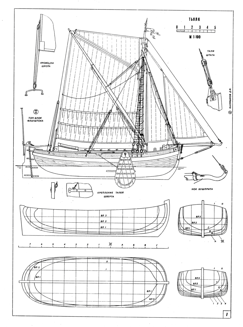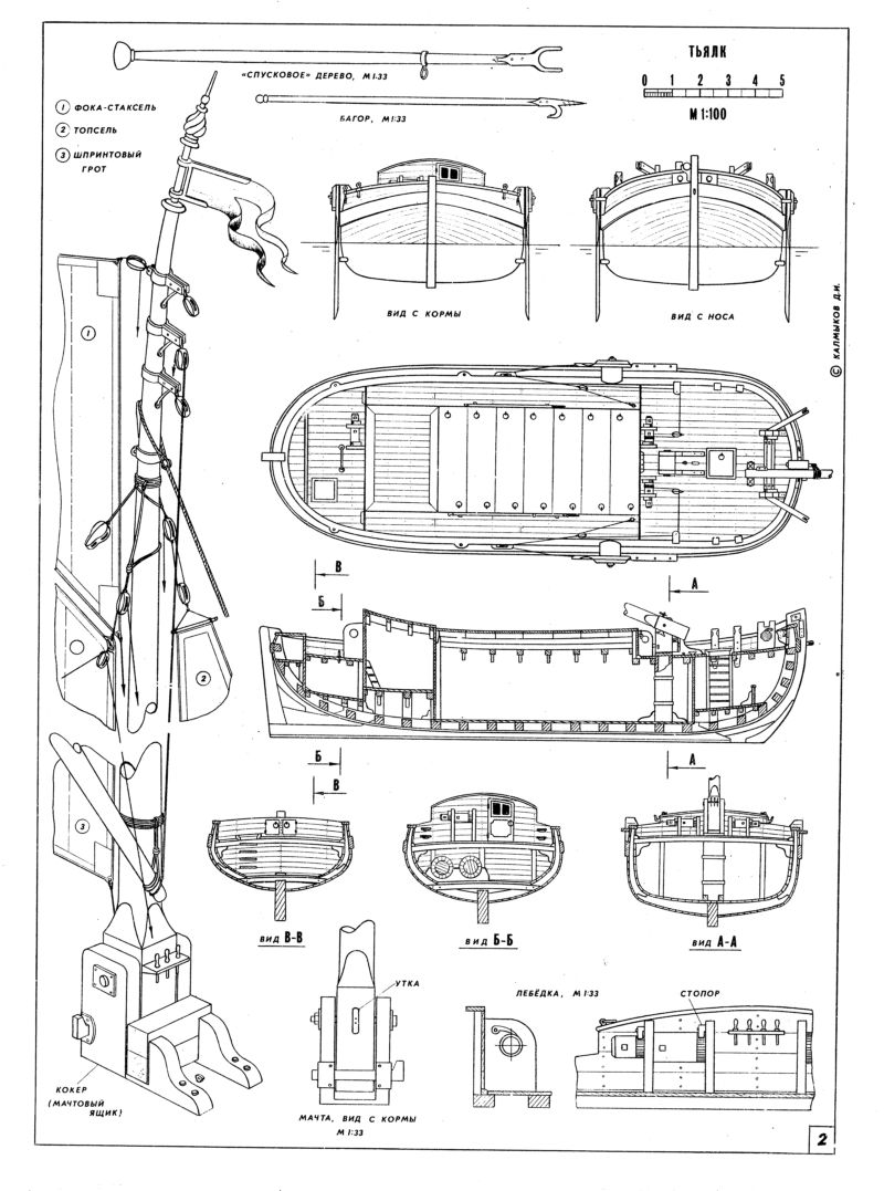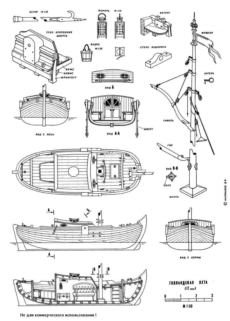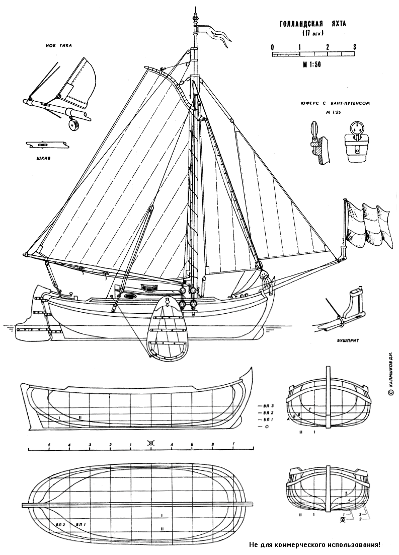 Если Вы решили сами построить модель парусника, но не знаете, с чего начать, рекомендую Вам прочитать эту страницу и воспользоваться приведенными здесь чертежами небольшой голландской яхты. Согласитесь, корабль-прототип совсем несложный, не имеет резного декора, но вместе с тем его силуэт с боковыми швертами и невысоким павильоном не лишен элегантности, присущей всем малым парусным судам Голландии. Мачта имеет две пары вант и штаг, который заканчивается большим пятидырочным юферсом, непосредственно принайтовленным к штевню. На стеньге установлен флюгер. Парусное вооружение яхты состоит из грота-триселя, фока-стакселя и летучего кливера. Гафель значительно короче, чем на других гафельных судах, и имеет изогнутую форму. На ноке бушприта находится гюйс-шток.