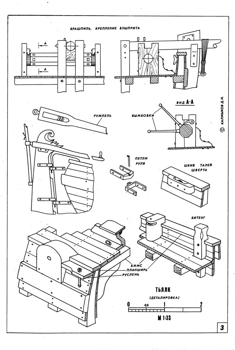 Корпус модели проще всего делать долбленым из бруска липы - исключительно мягкое, удобное в обработке дерево! Выструганный и выдолбленный корпус тщательно зашкуривают, приклеивают к нему киль, ахтерштевень, форштевень, бархоут и планширь. Деревянную обшивку можно имитировать с помощью чертежного измерителя, слегка процарапывая им параллельные бархоуту линии, либо делать из тонких деревянных реек.